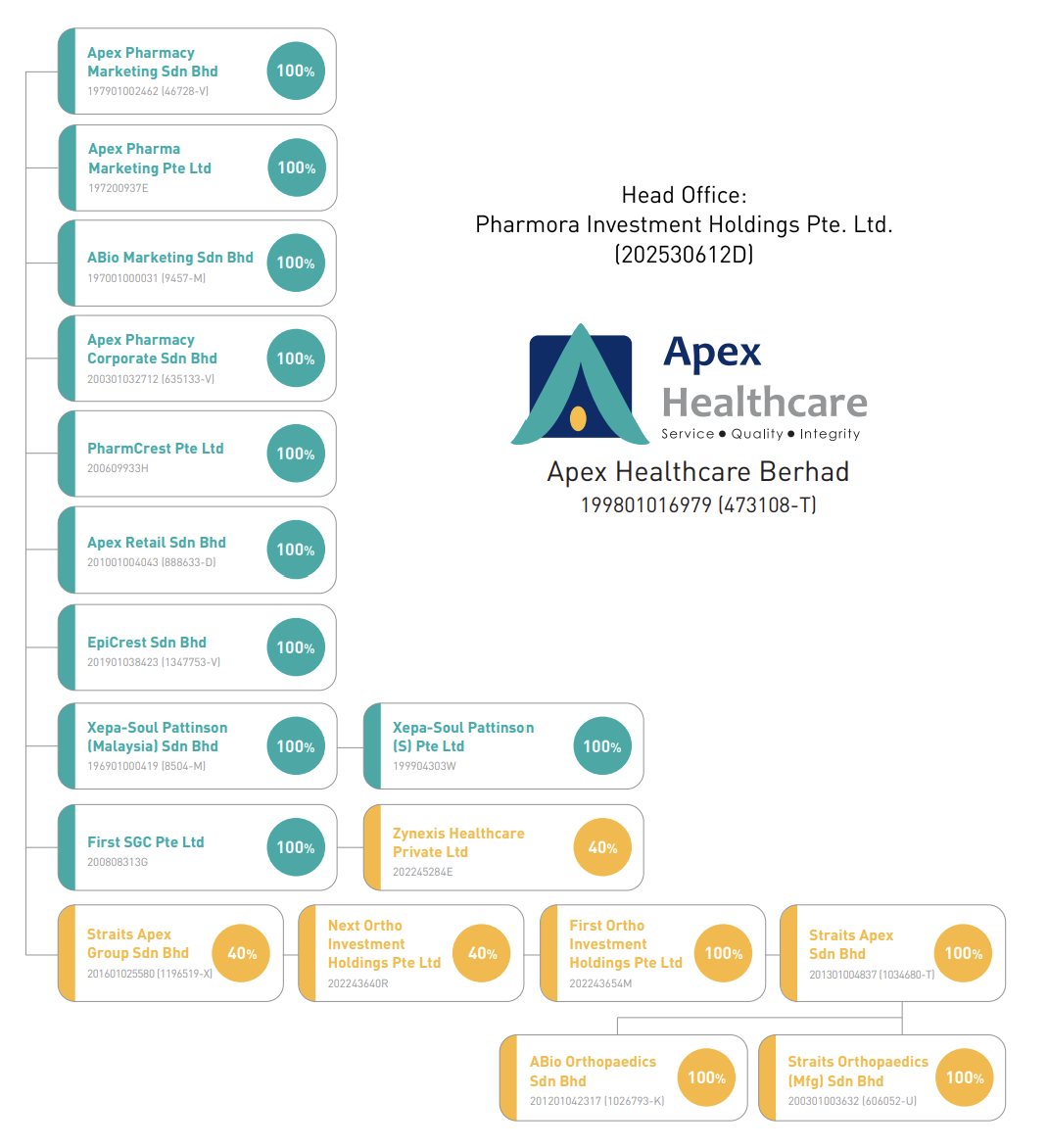 Apex Healthcare Berhad, a subsidiary of Pharmora Investment Holdings Pte Ltd, is a leading pharmaceutical group headquartered in Singapore, with operating subsidiaries in Malaysia and Singapore, and a commercial presence in over 20 countries worldwide.